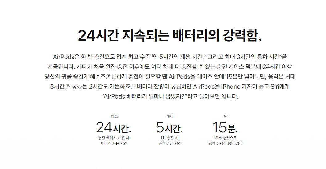 에어팟 2세대는 한 번 충전 시 음악 재생은 최대 5시간, 통화는 3시간 가능합니다.