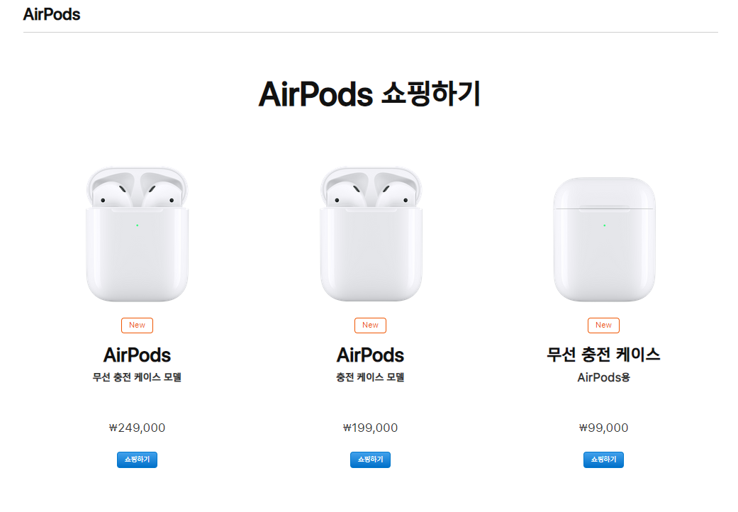 이번 에어팟 2세대는 무선 충전 케이스 모델이 249000원, 8핀으로 충전하는